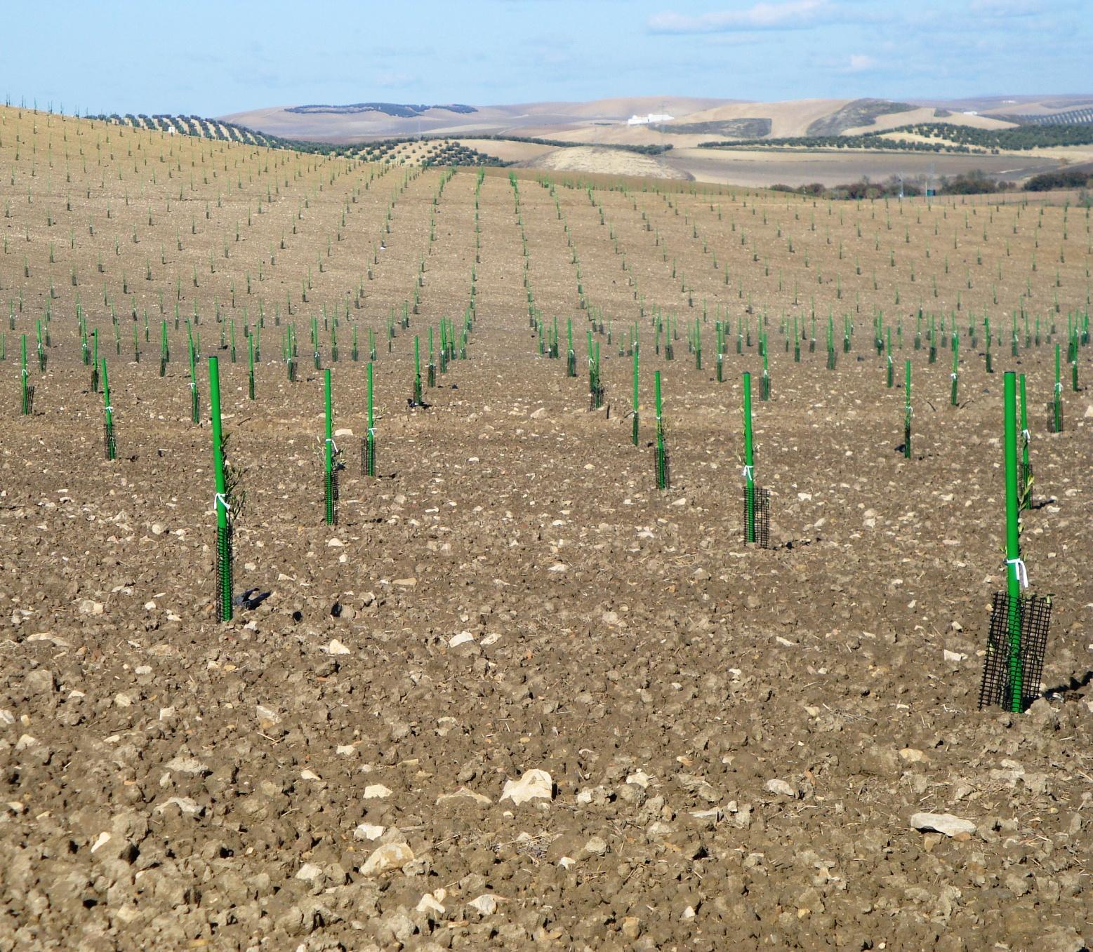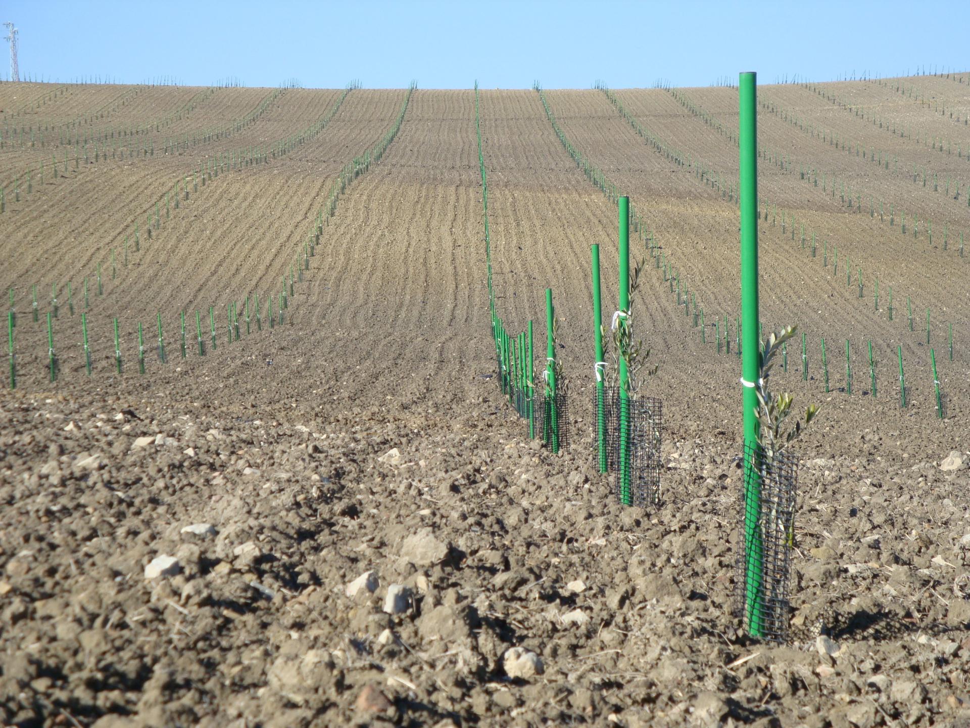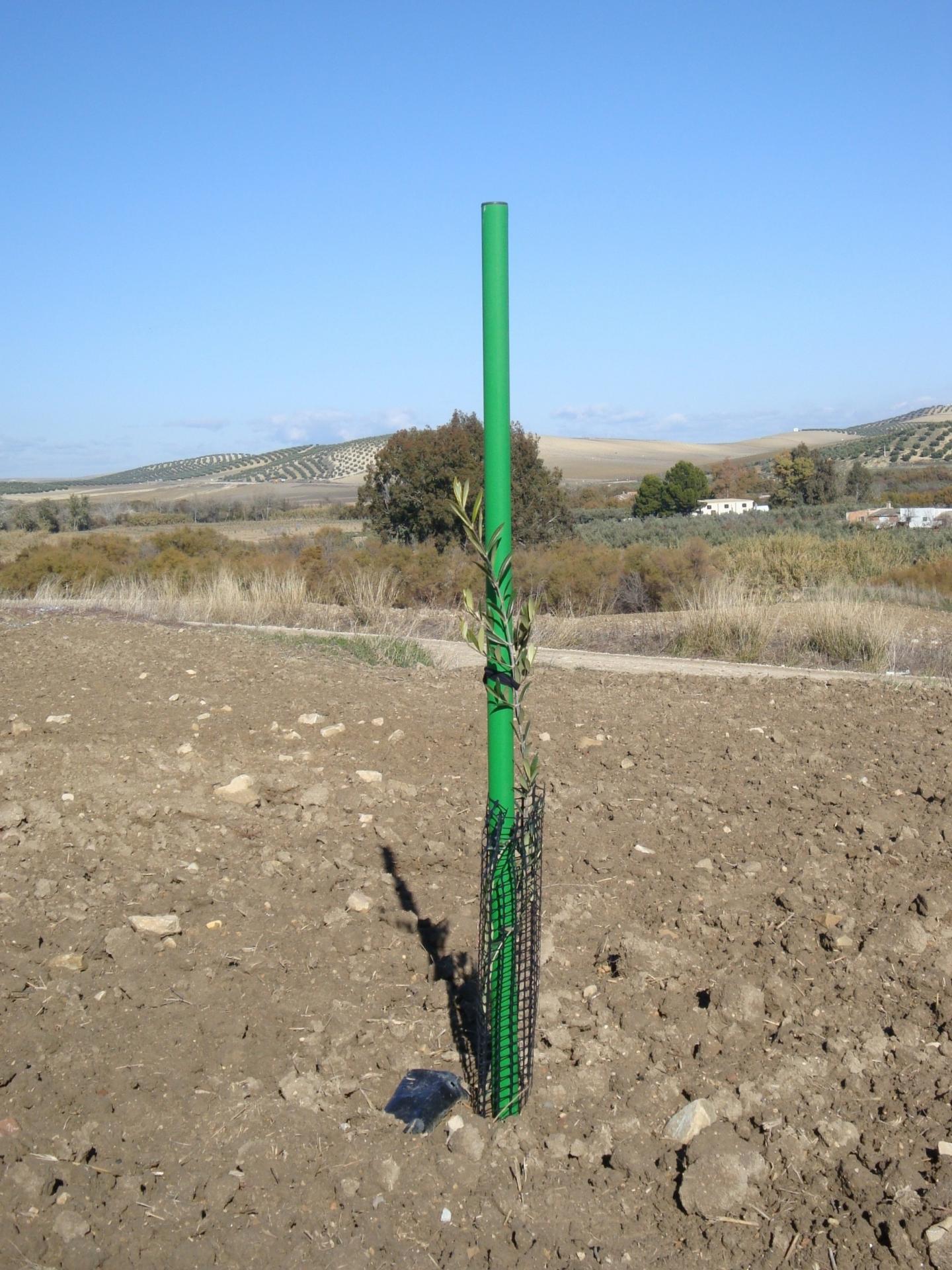 Tutor sintético verde (con punta y tapón) para olivar, almendros, pistacheros y tropicales. Diámetro 4 cm x 150 cm de altura.